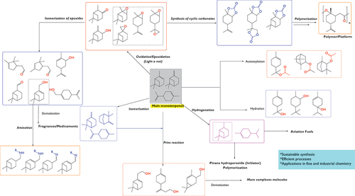 Tim peneliti menyoroti beragam jenis reaksi yang digunakan untuk mengolah monoterpen, seperti: