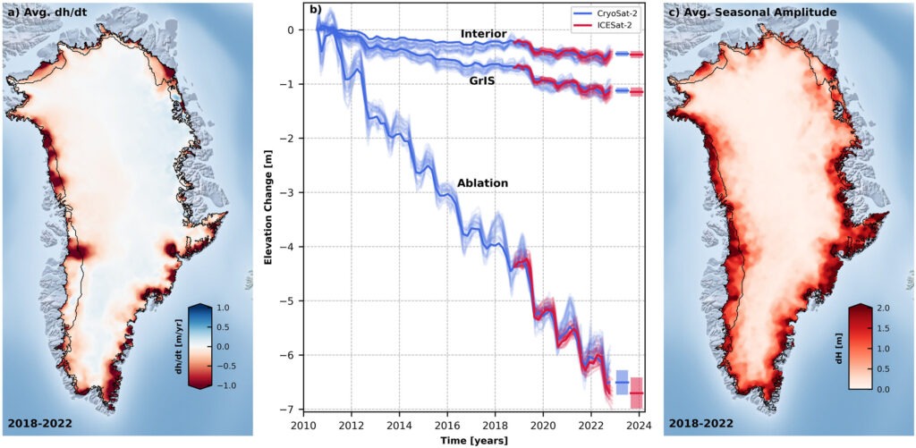 Hasil pengukuran dari tahun 2010 hingga 2023 menunjukkan bahwa Lapisan Es Greenland telah menipis rata-rata sebesar 1,2 meter. Namun, di bagian tepi lapisan es, di mana pencairan es terjadi lebih cepat, ketebalan es berkurang lebih dari 6,4 meter. Beberapa daerah yang mengalami pencairan ekstrem termasuk Sermeq Kujalleq (Jakobshavn Isbræ) di barat Greenland yang kehilangan hingga 67 meter es, dan Zachariae Isstrøm di timur laut yang kehilangan hingga 75 meter.
