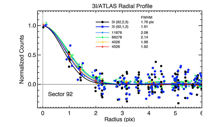 Ketika para ilmuwan memeriksa dua kelompok citra gabungan yang dihasilkan dari data TESS, mereka membandingkan profil cahaya radiala atau radial profile dari komet dengan objek lain yang tidak aktif. Profil radiala dapat menunjukkan apakah cahaya komet menyebar lebih luas daripada titik cahaya bintang biasa. Jika cahaya melebar, itu adalah tanda adanya coma. Namun ternyata kedua kelompok data menunjukkan bahwa profil cahaya 3I ATLAS sangat mirip dengan objek yang tidak aktif. Hal ini berarti tidak ditemukan bukti coma yang luas dalam pengamatan TESS.