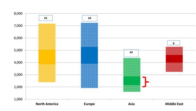Pertama, nuklir mahal itu di mana? Di Eropa dan Amerika Serikat. World Nuclear Association membuat analisis berapa estimasi rentang biaya pembangunan PLTN di berbagai belahan dunia. Hasilnya, biaya pembangunan di Asia lebih rendah daripada di Eropa dan Amerika Serikat [3], sebagaimana ditunjukkan dalam grafik berikut.