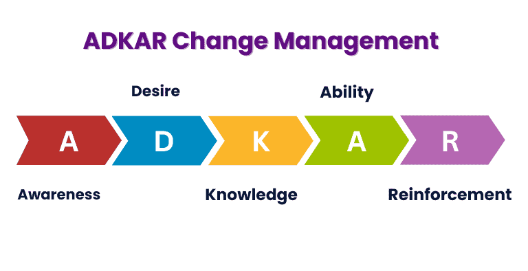 - Fase 2: Mengelola Proses Perubahan, organisasi mulai mengarahkan adopsi perubahan secara aktif. Di sinilah rencana-rencana spesifik—seperti rencana komunikasi, rencana pelatihan, rencana sponsorship, dan rencana pengelolaan resistensi—didesain, dijalankan, dan disesuaikan dengan dinamika yang terjadi. Fase operasional ini secara langsung memanfaatkan pendekatan ADKAR untuk memandu individu dan tim melewati masa transisi, memastikan bahwa mereka tidak hanya memahami tetapi juga mampu dan bersedia untuk beralih ke cara-cara kerja yang baru.