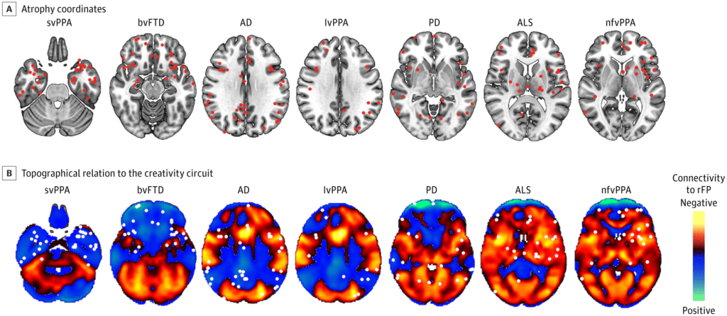 Sebagai contoh, beberapa pasien dengan penyakit neurodegeneratif seperti semantic variant primary progressive aphasia (svPPA) atau behavioral variant of frontotemporal dementia (bvFTD) menunjukkan peningkatan kreativitas, meskipun mereka mengalami atrofi (penyusutan) di area otak yang berbeda. Dalam studi ini, para peneliti menemukan bahwa pasien dengan atrofi di bagian otak yang terhubung positif dengan right frontal pole cenderung mengalami peningkatan kreativitas, sedangkan pasien dengan atrofi di bagian yang terhubung negatif dengan right frontal pole mengalami penurunan kreativitas.