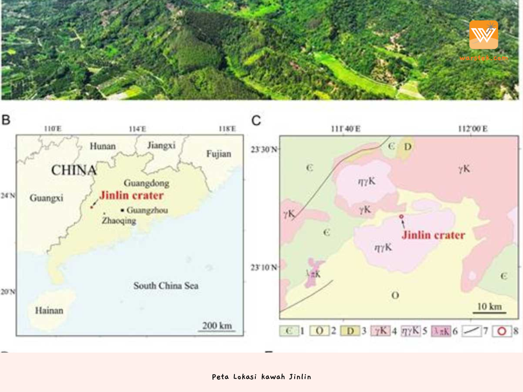 Kawah Jinlin ditemukan di wilayah barat laut Provinsi Guangdong, dekat Kota Zhaoqing. Para peneliti dari Center for High Pressure Science and Technology Advanced Research menyatakan bahwa kawah ini kemungkinan terbentuk selama periode Holosen, yaitu dalam 11.700 tahun terakhir. Temuan ini memberikan wawasan baru tentang skala dampak benda-benda luar angkasa kecil di era Holosen, yang ternyata jauh lebih besar daripada yang sebelumnya diperkirakan.