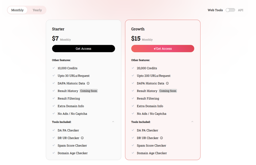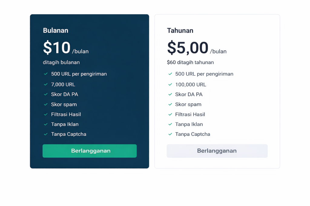 DA PA Checker menawarkan versi gratis dan premium. Paket premium mencakup opsi “Bulanan dan Tahunan”. Berikut adalah paket bulanan: