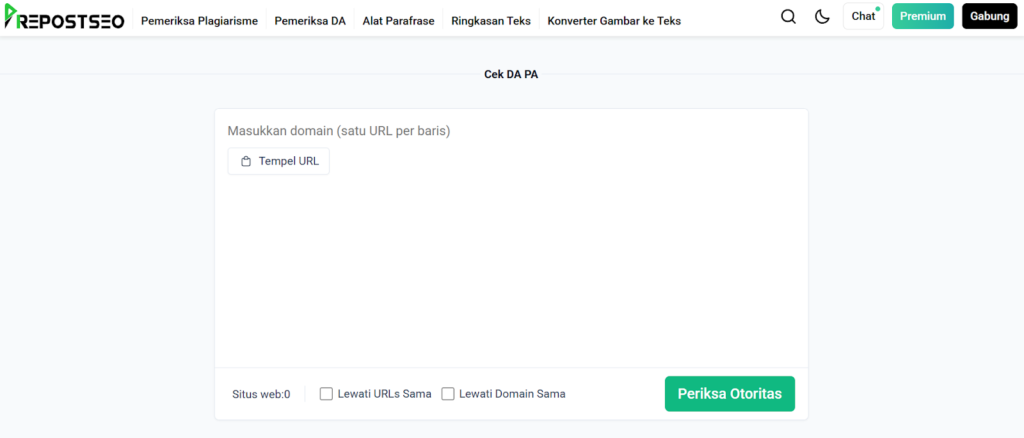 Tautan Alat:https://www.prepostseo.com/id/domain-authority-checker
